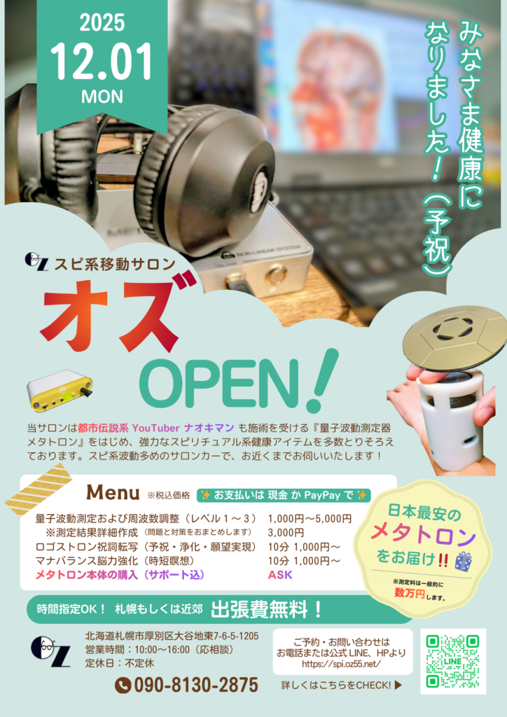 12月1日より、「スピ系移動サロン・オズ」オープンしております。